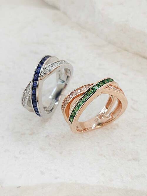 - 14K 18K 브릭레일 레이어드 반지(야그 에메랄드,화이트큐빅)