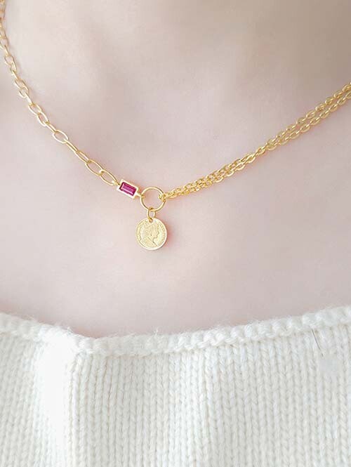 두 가지 디자인의 펜던트와 믹스체인이 언발란스하게 연결된 목걸이