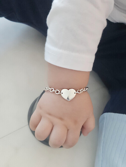 입체적인 하트 메달에 사슬체인이 연결되어있는 세련된 디자인의 아기 실버 은팔찌